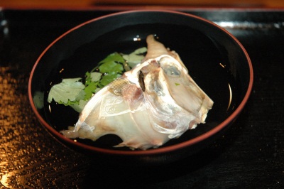 本カワハギの澄まし 次のお鮨を楽しんで頂くために、すっきりとしたお椀で一度口の中を洗う意味もあるのです。 ほっとするお椀です。 上記のように説明すれば簡単に言えますが、実はとても手間の掛かっているお椀です。 カワハギの頭を良く洗い、薄く塩をして陰干し3時間。 その後、軽くあぶって冷ましてから、昆布出汁と一緒に水から炊きます。 灰汁を丁寧にすくいながら出汁が引けたら、塩と、白醤油で味付け。 仕上がるまでに6時間ほど掛かっているお椀です。