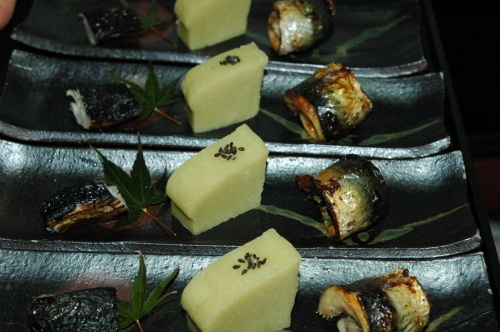 前菜として、三点盛りは左から、燻しかつお、蒸し芋羊羹、大葉イワシ幽庵焼きです。 藁で燻したかつおの豊かな香りをお楽しみ下さい。